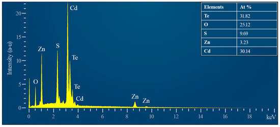 Figure 4 shows the EDX spectrum and the ratio of components on the surface of the formed structure. It can be seen that there are spectra from Zn, S, Cd, Te, and O. Zn and S are present at low concentrations (3.23% and 9.69%, respectively); this indicates that the surface of the samples is quite densely overgrown with cadmium-tellurium oxides. The highest concentration is oxygen, which indicates its presence in various compounds of cadmium and tellurium. Reflexes of other elements were not detected.