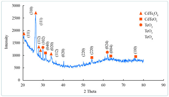 Noise is present in the right region of the spectrum, a halo is present in the (50–70) 2θ region, and a very weak intensity indicates surface amorphization due to the transition from CdTe3O8 and CdTeO3 oxides to TeO4 and TeO2. Furthermore, in [63], the haloes are associated with the presence of TeO2. Evidence of the presence of tellurium oxides is also seen in the yellow color of the sample surface, which is characteristic of the amorphous α-TeO3 phase. These results agree well with the previously made assumption of the presence of several oxides on the surface of the synthesized heterostructure.