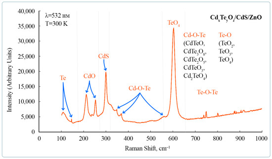 The most intense peak at 603 cm−1 can be associated with the first overtone mode of 2LO CdS. However, there are reports that indicate that the intense peaks in the region of 550–600 cm−1 are due to the vibrational modes of TeO4 [65]. At the same time, the intensity of the spectrum depends on the concentration of oxygen in the compounds. That is, the TeO4 compound is present in various types of cadmium-tellurium oxide. Note that in our case, the intensity of the peak may be caused by the manifestation of quantum-size effects owing to the presence of nanometer-sized crystallites. This size of the crystallites allows them to be classified as quantum dots.