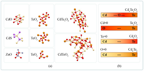 Table 2 also shows the affinity of the binary oxides TeO2 and TeO4 with the ternary compounds CdTeO3 and CdTe3O8, respectively. Figure 6 shows that TeO2 is bonded to four oxygen atoms, while TeO4 and TeO3 have six bonds each, with the difference that TeO4 has one non-bridging oxygen, that is, it is bonded to only one oxygen atom. The ternary crystals of CdTeO3 and CdTe3O8 have only Cd-O and Te-O bonds, but no Cd-Te bonds [72]. On this basis, it can be assumed that the oxides CdO and TeO4 initially form on the surface and later evolve into TeO2 and TeO3 when saturated with oxygen. These oxides, in turn, are components of the ternary oxides CdTeO3 and CdTe3O8.