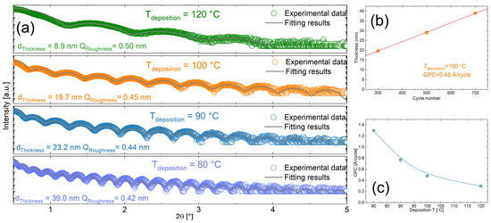 (a) XRR data of ALD coating with SbOx thin film for 300 cycles at different deposition temperatures. (b) Thickness data determined via XRR plotted vs. cycle number. (c) Growth per cycle (GPC) data determined via XRR plotted vs. deposition temperature.