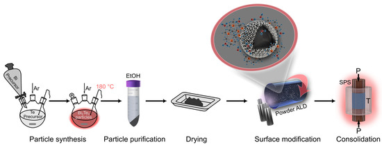 Flow chart for sample preparation of Bi2Te3 particles via solvothermal synthesis, surface modification via powder ALD and consolidation via SPS. Reproduced with permission [12]. Copyright 2022, WILEY-VCH Verlag GmbH & Co. KGaA, Weinheim.