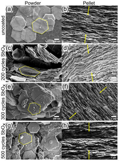 SEM images of (a) solvothermally synthesized Bi2Te3 particles, (b) cross-section of sintered pellet, (c) Bi2Te3 particles SbOx-coated for 200 cycles and (d) cross-section of sintered pellet, (e) Bi2Te3 particles SbOx-coated for 300 cycles and (f) cross-section of sintered pellet, (g) Bi2Te3 particles SbOx-coated for 500 cycles and (h) cross-section of sintered pellet. The arrows indicate the pressing direction.