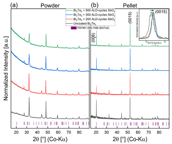 XRD pattern of (a) uncoated and SbOx-coated powders and (b) the sintered pellets. All diffractograms are matched to the Bi2Te3 phase (PDF#01-086-7486).