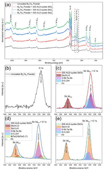 Figure 5a shows the XPS survey spectra of Bi2Te3 particles uncoated and SbOx-coated with 200, 300, and 500 ALD cycles. The Bi and Te peaks resulting from the substrate powder were identified. The detailed spectra in Figure 4b–e show that the O 1s overlaps with the Sb 3d region. The uncoated sample (Figure 4b) shows just the O 1s peak, whereas the coated samples (Figure 4c–e) show Sb 3d3/2 and 3d5/2 peaks, which makes a deconvolution necessary. With increasing numbers of cycles, the SbOx species tend towards a higher oxidation state, starting with Sb2O3 at 200 cycles, a mixture of Sb2O3 and Sb2O5 at 300 cycles, and Sb2O5 at 500 cycles. In addition to the non-structural binding states of O to Carbon and Hydroxide, bindings to Bi, Te, and Sb were also detected. Additionally, the SbOx-coated sample with 300 cycles showed another complex bonding of oxygen to metals, which can be attributed to a formation of Sb- or Bi-oxy-telluride.