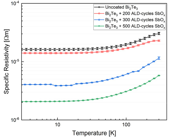 The specific resistivity as a function of the temperature of sintered pellets is shown in a double logarithmic plot in Figure 6. With increasing number of cycles, the resistivity decreases by one order of magnitude for 500 cycles of SbOx. Since SbOx is a dielectric, the increase in conductivity is unusual, and can be explained by the formation of defects during the ALD process. The formation of Bi-O-Te and Sb-O-Te species was shown by XPS, resulting in an off-stoichiometric substrate (Bi2−xTe3−y) material. Independent of the sample, the resistivity increases towards higher temperatures, which could be a result of the scattering of charge carriers at the grain boundaries [2].