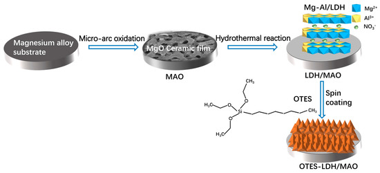 - Zhang, G.; Tang, A.T.; Wu, L.; Zhang, Z.Y.; Liao, H.X.; Long, Y.; Li, L.J.; Atrens, A.; Pan, F.S. In-Situ Grown Super-or Hydrophobic Mg-Al Layered Double Hydroxides Films on the Anodized Magnesium Alloy to Improve Corrosion Properties. Surf. Coat. Technol. 2019, 366, 238–247. [Google Scholar] [CrossRef]