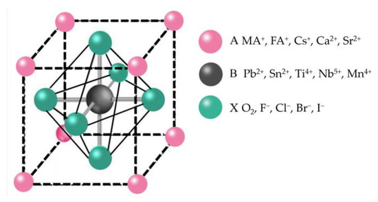 The serious consumption of energy and environmental problems have aroused people’s attention to renewable energy. Over the past decade, solar energy systems have proved to be the most compelling of all renewable energy systems [1]. Perovskite is considered a hopeful photovoltaic candidate due to its high optical absorption coefficient, tunable band gaps, long charge carrier life, low cost, and simple preparation process [2,3,4,5,6,7]. The power conversion efficiency (PCE) of perovskite solar cells (PSCs) has jumped from 3.8% to 25.73% (certified) [8]. As shown in Figure 1, ABX3 is the general formula crystal structure of perovskite materials. A is a large radius cation such as CH3NH3+ (MA+), NH2CH=NH2+ (FA+), Cs+, Ca2+, and Sr2+ B is Pb2+, Sn2+, Ti4+, Nb5+, Mn4+, and other small radius cations. X are anions such as O2, F−, Cl−, Br−, and I− [9,10]. The tolerance factor t could be used to calculate the perovskite crystal structure stability. The t = (RA + RX)/(RB + RX), where RA, RB, and RX refer to the ionic radii of A, B, and X site ions, separately. In general, the tolerance factor of structurally stable, highly symmetrical cubic structured perovskites usually ranges from 0.813 to 1.107 [11,12]. Within this range of tolerance factors, different stabilities and band structures of perovskite materials were obtained by doping or replacing the A, B, and X site ions [13]. For example, adding Sn to Pb-based perovskites could reduce the band gap and effectively broaden the absorption spectrum in the near-infrared [14,15]. With this advantage, perovskite materials can be combined with different forbidden bandwidths of light-absorbing materials, such as Si and quantum dots, to make stacked cells, such as perovskite-Si [16,17], perovskite-chalcogenides [18,19], and perovskite-quantum dots [20].