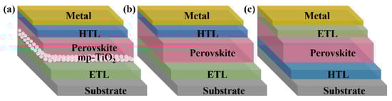Three representative structures of PSCs: (a) mesoporous structures; (b) regular planar (n-i-p) structures, and (c) inverted planar (p-i-n) structures.