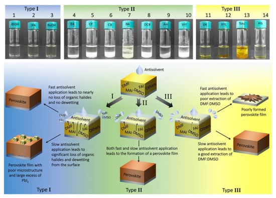 Summary of the processes taking place during perovskite film formation for the three antisolvent types. Top: solubility of MAI in a solution of DMF:DMSO:antisolvent, meant to simulate the perovskite film intermediate phase during the antisolvent step of fabrication. Bottom: summary of the various mechanisms involved in perovskite film formation by the different categories of antisolvents [154].