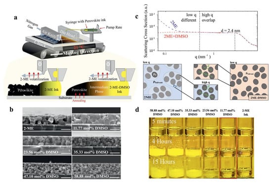 Schematic illustration of slot-die coating. (a) Coating from 2-ME and 2-ME-DMSO inks; (b) Cross-section SEM images (scale bar is 800 nm); (c) SAXS curves of two backgrounds, subtracting scattering curves of MAPbI3 in 2-ME (blue) compared to MAPI in 2ME with 11.77 mol% DMSO (red). Both solutions are in the same concentration; (d) Images of 2-ME DMSO inks (in the duration of 1 to 15 h) stored inside the glovebox (with O2 and H2O levels less than 1 ppm) [179].