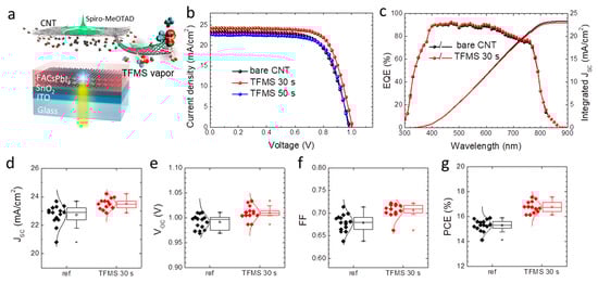 (a) Schematic illustration of planar heterojunction PSCs based on TFMS-doped CNT. (b) J−V curves of the highest PCE PSCs, incorporating bare CNT and CNT doped by TFMS 30 and 50 s. (c) EQE spectra and corresponding integrated short-circuit current density (JSC) of the device based on bare CNT and CNT doped by TFMS for 30 s. (d) JSC. (e) open circuit voltage (VOC). (f) fill factor (FF) and (g) PCE of the PSCs incorporating bare CNT and CNT doped by TFMS [218] 2019 American Chemical Society.