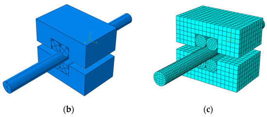 In the second-level model, solid units are used to simulate the cable saddle and the steel wire in the saddle groove, and the single steel wire at the bottom of the saddle groove is simulated in the form of actual cross-section, as shown in Figure 10. Among them, five steel wires are arranged in two layers, with a diameter of 5.65 mm and a length of 80 mm. The cable saddle is simulated as a “U” shaped saddle groove, with a thickness of 5 mm, a length of 40 mm, and a width of 16.95 mm in the groove, which can accommodate three steel wires arranged in parallel. The upper steel wire was simulated as a steel plate, 5 mm thick, 16.95 mm wide, and 40 mm long.