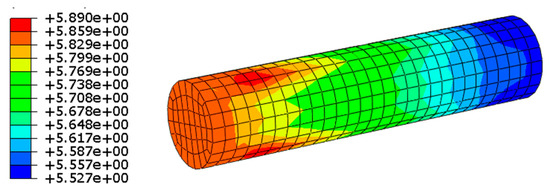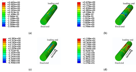 By comparing the normal stress nephograms of the two stages, it is not difficult to notice that the axial distribution of normal stress in all directions in the middle clamping region of the second stage increases from the fixed end to the loading end, while the axial distribution of normal stress in all directions in the middle clamping part of the first stage is uniform, which indicates that the filled wire and the center wire slip in the second stage, and the shear stress can no longer be ignored. Figure 6 shows the distribution of τxz and τyz. It can be seen that the shear stress in the first stage is mainly concentrated at the end of the clamping region, while the range of the shear stress in the second stage gradually increases from the fixed end to the loading end, and the shear stress stops when it increases to about 6.4 MPa. This indicates that the relative slip degree between the center wire and the packed wire also increases gradually from the fixed end to the loading end.