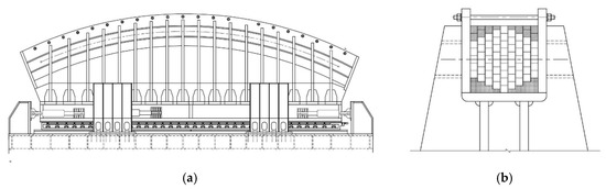 The main cable specification of a suspension bridge is 5.65–127 × 247, and with five main cable ventilation pipes. The center curvature radius of the main cable at the saddle of the main pylon is R = 18 m; the width and height of a single strand channel are 62.5 mm and 64 mm, respectively. The width and height of a single strand channel are 62.5 mm and 64 mm, respectively. The facade of cable saddle and the cross-section of the cable saddle groove is shown in Figure 8a,b.
