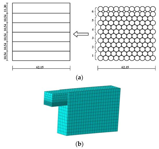 The first stage model takes the saddle groove in the middle of the cable saddle, located at the outlet of the cable saddle, with a central angle of 1°. The diameter of each wire in the first-level model is 5.65 mm. The saddle groove size was modeled according to the actual single-groove cable strand size of the main cable saddle. The width of the saddle was 62.15 mm, the depth was 60.23 mm, the width of the two sides of the baffle was 5 mm. As shown in Figure 9a, simplification was adopted, a single strand was divided into six layers, and the equivalent rectangular section size of each strand was the size of the outer contour of each strand.