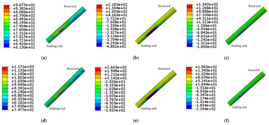 The normal stress distribution of local elements in the span of steel wire along all directions of the global coordinate system. Where, (a–c) are normal stress nephograms of steel wire along Z axis (axial direction), Y axis, and X axis, respectively, (d–f) are normal stress nephograms of steel wire along Z axis (axial direction), Y axis, and X axis, respectively, for fatigue upper limit time.