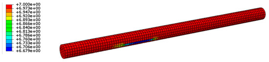 Figure 11 shows the normal stress nephograms of the upper and lower limits of the steel wire under fatigue loading. At the lower limit of fatigue (the first stage), the axial uniform tensile load is 744.0 MPa. The maximum normal stress along the Z axis (axial direction) is tensile stress, and the maximum normal stress along the Y axis is 218.3 MPa and the minimum normal stress is −488.2 MPa. The maximum and minimum normal stresses along the X axis are 154.7 MPa and −180.0 MPa. At the fatigue limit (the second stage), the axial uniform tensile load is 900.0, in which the normal stress along the Z axis is tensile stress, and the maximum is 1171.0 MPa. The maximum normal stress along the Y axis is 266.5 MPa and the minimum is −593.7 MPa. The maximum and minimum normal stresses along the X axis are 188.3 MPa and −219.4 MPa, respectively.