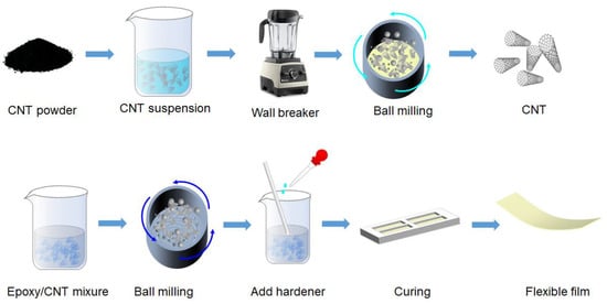 CNTs are one-dimensional (1D) tubes with exceptional mechanical properties and aspect ratios ranging from 30 to thousands. CNTs and CNT-based derivatives [24,25,26] have seen a significant increase in interest in recent years due to their high chemical stability, unique morphology, and electronic and mechanical properties. Adding CNTs or CNT derivatives to polymers at extremely low loading enhances their electrical, thermal, and mechanical properties [27]. Several studies have investigated the structure-property relations of polymer/graphene and CNT nanocomposites. The dispersion and interfacial adhesion of carbon-based nanomaterials within an epoxy matrix are critical factors affecting the performance enhancement of epoxy nanocomposites [28,29,30,31,32]. In addition, it is important to note that polymer properties, nanofiller conductivity, structural characteristics, and dispersion quality are key factors affecting composite-based sensor performance.