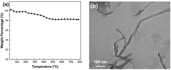 Thermogravimetric analysis (TGA) was employed to investigate the thermal stability of carbon nanotubes (CNTs) under N2 atmosphere, with heating ranging from 50 to 800 ℃, as depicted in Figure 2a. The TGA results revealed that the CNTs did not exhibit any significant weight loss at 800 ℃, indicating their high thermal stability. After, the as-received CNT product is unwound using the wall breaker and ball mill where the length of the CNTs will be reduced. Under the shear force of the action, the intertwined CNTs will separate from each other, resulting in a decrease in size. The transmission electron microscopy (TEM) image of CNTs dropped from an aqueous solution is presented in Figure 2b, revealing the individual existence of CNTs and confirming their well-dispersed and disentangled characteristics. The homogeneous dispersion of CNTs is crucial for the development of electrically conductive nanocomposites with high mechanical performance [35,36].