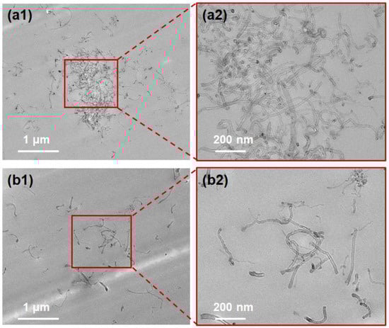 TEM images of epoxy/CNT nanocomposites with different preparation methods at 0.5 vol%: (a1,a2) mechanical mixing and (b1,b2) ball milling.