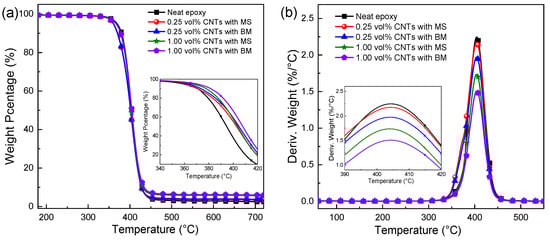 Thermogravimetric analysis (TGA) was carried out to assess the thermal stability of epoxy and epoxy/CNT nanocomposites under N2 atmospheres. Epoxy/CNT nanocomposites possess a one-stage degradation process under N2 in Figure 5a, exhibiting similar decomposition behaviors to neat epoxy, where the first stage is mainly due to the thermal degradation of epoxy chain networks. Tonset and Tmax respectively refer to the temperatures where the 5% weight loss and the maximum weight loss rate occur. From Figure 5a,b, Tonset and Tmax of epoxy/CNT nanocomposites are higher than a neat epoxy system, which is expected as the introduction of CNTs improves the thermal stability of epoxy. When compared to the epoxy/CNT prepared by the mechanical stirring (MS) method, the epoxy/CNT systems prepared by ball milling (BM) exhibit higher Tonset and Tmax, which could be attributed to the fact that the relatively uniformly dispersion of CNTs in the matrix was improved by ball milling. The nanotubes of relatively uniform dispersion are more likely to form a three-dimensional thermal barrier in the matrix.