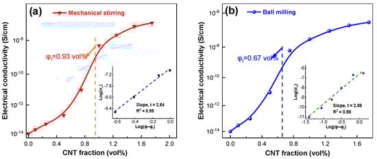 Figure 6 depicts the electrical conductivity of the epoxy/CNT nanocomposites with different preparation methods. It can be observed that the electrical conductivity of the neat epoxy is ~3 × 10−13 S/cm, which falls within the range (10−12~10−14 S/cm) reported in previous studies on epoxy [37,38,39]. The addition of CNTs using both hand stirring and ball milling methods led to an increase in the electrical conductivity of the epoxy/CNT nanocomposites. As the volume fraction of CNTs increased, the inter-filler distance reduced, and at a certain threshold (percolation threshold), a network of conductive paths was formed by the fillers, thereby rendering the insulative nature of the epoxy ineffective. The experimental data were fitted into a power law equation to carry out further analysis: