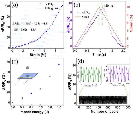 Figure 7c depicts the resistance-impact energy response of the flexible film sensor. Different impact energies are simulated by controlling the falling height of a steel ball. The relative resistance increases linearly from 0 to 78% within an impact energy range of 0–1 J. This indicates that the epoxy/CNT flexible film may work as a multi-stimulus, high-sensitivity sensor for structural health monitoring.