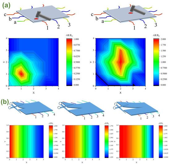 Detecting and localizing damage in structural components is crucial for efficient maintenance and repair. To achieve this goal, a flexible sensor is placed on a horizontal table and a practical impact simulation is conducted. Figure 8a illustrates that the lower left corner and center parts were hit. The resistance change rate of the film sensor varies under external strain. Based on this principle, a strain contour cloud map can be generated to identify the damage location. The map also indicates the areas with higher force, displayed as red, and the regions with lower force, shown as blue.