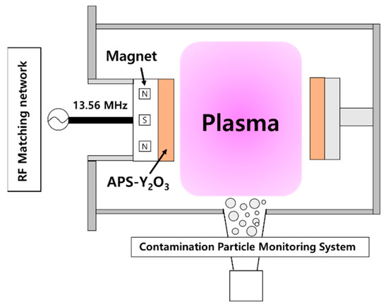 To evaluate the plasma resistance of the APS–Y2O3 coating, a vertical conductively coupled plasma-reactive ion etching (VCCP-RIE) system was used, as shown in Figure 2. The plasma density was enhanced by arranging a niobium magnet in 1000 G on the upper electrode. The RF power used was 13.56 MHz (Sizer Generator, Advanced Energy, Fort Collins, CO, USA), and an impedance matching network was employed (Navigator, Advanced Energy, Fort Collins, Denver, CO, USA). It was exposed to fluorine-based plasma (CF4/O2/Ar) used in the etching process; Table 1 presents the detailed conditions. The contamination particles generated due to plasma exposure were measured in real time using an in situ particle monitor (ISPM; Stiletto, INFICON, Heidland, Switzerland). To compare the amount of contamination particle generated before and after cleaning with the piranha solution, the APS–Y2O3 coating was first exposed to CF4/O2/Ar plasma. Subsequently, the amount of contamination particle generated by re-exposure to the CF4/O2/Ar plasma without any cleaning was compared with the amount of contamination particle generated after the cleaning.