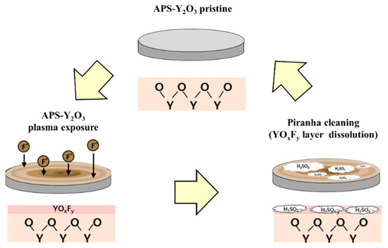 Plasma is used in various processes, such as etching, deposition, and cleaning, in the semiconductor/display industry. Since the etching process uses plasma composed of highly reactive carbon-, fluorine-, and chlorine-based compounds, it induces a chemical reaction with the internal components of the chamber. The by-products of this reaction formed on the surface are deposited on the surrounding parts, generating contamination particles, which ultimately affect the product yield [1,2,3,4,5]. Therefore, the chamber wall and internal parts are coated with plasma-resistant materials using various coating methods for the semiconductor etching process. Al2O3 and Y2O3 are widely used as ceramic coating materials exhibiting plasma corrosion resistance [6,7,8,9,10,11,12,13,14,15]. Conventionally, Al2O3 has been used as a representative plasma corrosion resistance material owing to its low price and easy sintering process. However, it lacks chemical stability to highly reactive halogen element radicals. Y2O3 is widely applied as a plasma corrosion resistance material owing to its lower etch rate and better chemical stability than Al2O3 for fluorine-based plasma during the semiconductor etching process. The atmospheric plasma spraying (APS) coating method is commonly used in the industry; this is attributed to the fewer restrictions on raw materials and coating conditions, ease of control of the coating thickness, realization of complex shapes, and coating application over a large area [14,15,16]. However, when an atmospheric-plasma-sprayed Y2O3 coating is exposed to highly reactive fluorine-based plasma for a long duration, there is surface corrosion, and a YOxFy layer, which is a fluorinated layer, is formed. The YOxFy layer is the main cause of process drift and contamination particle generation [8,10]. To remove the fluorine contamination layer after plasma exposure, efforts have been made to clean and reuse the coating surface [17,18]. Cleaning a plasma-resistant coating requires physically etching the surface using a surfactant, and the degree of cleaning should be evaluated again after visual observation. Despite this problem, there has been no technical research on the cleaning technology for plasma-resistant coatings.