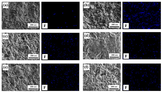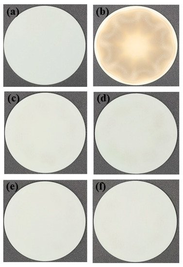 Figure 4 shows the surface images of the APS–Y2O3 coating before and after CF4/O2/Ar plasma exposure and after cleaning with the piranha solution. Figure 4a shows the surface image of pristine APS–Y2O3 before plasma exposure, and Figure 4b shows the image after plasma exposure. After exposure to fluorine-based plasma, a brown contamination pattern was formed on the coating surface. This is a fluorine contamination layer due to surface fluorination, which generates contamination particles [17,18]. Figure 4c–f shows that the APS–Y2O3 coating surface exposed to plasma was cleaned with piranha solutions prepared at ratios of 2:1, 3:1, 4:1, and 5:1, respectively. The fluorine contamination layer was removed regardless of the piranha solution ratio. Figure 5 shows the FE-SEM image for a more detailed surface analysis.