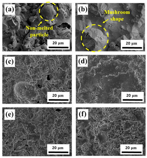 Figure 5a,b show the surface images before and after plasma exposure of the APS–Y2O3 coating, respectively. In Figure 5a, pores and nonmelted particles can be observed, which is common on an APS coating surface [15]. The APS coating powder has a size range of 30–50 , which is greater than those of other spray coatings [8,12]. In addition, the droplets were rapidly cooled as they collided with the substrate. Because of this, nonmelted particles were formed. Plasma erosion occurs from the edge of the nonmelted particles. Consequently, a mushroom-shaped etching trace could be observed, as shown in Figure 5b. Figure 5c–f shows the surface images after cleaning with piranha solutions prepared at ratios of 2:1, 3:1, 4:1, and 5:1, respectively. After cleaning with piranha solutions with ratios of 2:1, 4:1, and 5:1, a relatively rough surface with some pores was observed. In contrast, after cleaning with a piranha solution at a ratio of 3:1, a smooth surface with the least number of defects was observed.