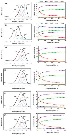 Figure 7 shows the XPS spectra and Ar ion sputtering depth profile of the APS–Y2O3 coating surface before and after CF4/O2/Ar plasma exposure and after piranha cleaning. Figure 7a shows an image of the APS–Y2O3 coating before plasma exposure. This process was performed in an atmospheric environment; therefore, the carbon present in the air penetrated the coating surface and existed therein. Therefore, carbonate bonding can be observed in Figure 7a. In the pristine APS–Y2O3 coating, the Y 3d3/2 and Y 3d5/2 peak positions were 157.6 and 155.5 eV, and two peaks had a difference of 2.1 eV with an intensity ratio of 3:2 in their binding energy [23,24]. After CF4/O2/Ar plasma exposure, the fluorine present on the surface was approximately 35%, and the Y–O bonds were replaced by Y–F bonds owing to surface fluorination. The Y–O and Y–F binding energies of Y 3d3/2 were 161.2 and 159.0 eV and those of Y 3d5/2 increased to 159.1 and 156.9 eV, respectively. This can be possibly attributed to the higher electronegativity of fluorine (4.0) atoms than oxygen (3.5) atoms [9,16]. Figure 7c–f shows XPS spectra and Ar ion sputtering depth profile, after cleaning with the piranha solution. The coating surface depth profile analysis shows that, after cleaning with the piranha solutions with ratios of 2:1, 3:1, 4:1, and 5:1, the fluorine content on the coating surface decreased to 2.49%, 2.35%, 3.18%, and 4.17%, respectively, decreasing within 5% regardless of the piranha solution ratio. Moreover, the binding energies of the Y 3d3/2 and Y 3d5/2 peaks were 158.0 and 155.9 eV, respectively. The binding energy was similar to that of the pristine APS–Y2O3 coating.