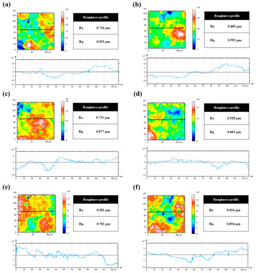 Figure 8 shows the surface roughness of the APS–Y2O3 coating before and after plasma exposure and after cleaning with the piranha solution. The pristine APS–Y2O3 coating shows a rough surface (Ra = 0.716 ) in Figure 8a. The APS coating uses a large powder size of approximately 30 . It is melted by the plasma jet and hits the substrate. At the same time, it cools rapidly, and nonmelted particles and pores are formed. Figure 8b shows the surface roughness of the APS–Y2O3 coating exposed to the CF4/O2/Ar plasma; the surface roughness value is lower than that of the pristine APS–Y2O3 coating. This was caused by flattening under continuous Ar+ bombardment. Figure 8c–f shows the surface roughness after cleaning with the piranha cleaning. At a ratio of 2:1, the roughness was similar to that of the pristine APS–Y2O3 coating. In particular, at a ratio of 3:1, the surface was relatively smooth, consistent with the SEM image shown in Figure 6. The surface roughness values under the other conditions were Ra = 0.582 and 0.654 , respectively, reflecting a smoother surface than the pristine APS–Y2O3 coating. These results confirmed that cleaning with the 3:1 piranha solution helped remove the most amount of fluorine contamination layer on the APS–Y2O3 coating, while imparting the smoothest surface.
