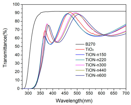 The transmittance of samples on glass substrates was measured with the Varian Cary 5E spectrometer. For films on silicon substrates, the ellipsometer was used to measure the Ψ and Δ values for fitting their optical properties, including n, k, and thickness d. Figure 3 shows the transmittance in the 250~700 nm region for all samples in Table 1. With a deposition time of 120 s, the thicknesses of samples TiO2, TiON-n150, TiON-n220, TiON-n300, TiON-n440, and TiON-n600 are about 191, 187, 176, 197, 197, and 202 nm, respectively. The transmittance for all samples in the second peak in the VIS region is higher than 85%. Moreover, sample TiON-n300 (pink color) has good transmittance at 360 and 500 nm. The threshold wavelengths of all samples are around 315 nm. The different spectrum shifting, resulting from the variation of the deposited film’s optical thickness (n × d), is discussed in the following section.