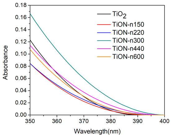 The absorbance spectra derived from the TL-mode are shown in Figure 7, indicating that compared with other samples, the spectrum of the TiON-n300 sample shifted obviously to the VIS region. These results suggest that the N-doped TiO2 film fabricated by AIP in a gaseous mixture of N2 and O2 with PN2/PO2 = 1/4 can attain the narrowest bandgap and the highest absorbance in the VIS region.