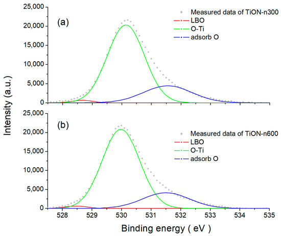 In order to further investigate the phenomenon that the N-doped TiO2 film with PN2/PO2 = 1/4 exhibits the best photocatalytic performance, XPS of samples TiON-n300 and TiON-n600, deposited with PN2/PO2 = 1/4, 1/1.5, respectively, were conducted to evaluate their compositions. Figure 8 shows the XPS spectra of oxygen for the samples, with peaks ranging between 528 and 534 eV. Typical peaks near 528.4, 529.8, and 531.5 eV are observed. The strongest 529.8 eV peak corresponds to the O–Ti binding [50], and the much weaker 528.4 eV one represents the low-binding-energy (LBO) oxygen originating from those non-bridging oxygen (NBO) species [44]. Hsu et al. suggested that the bond at the non-bridging sites reduced the total energy of the oxide formation. The concentration of LBO in the TiO2 film was always the smallest among all components [51]. The 531.5 eV peak is from the oxygen absorption of C–O and H2O, which may come from the air and organic pollution [52].