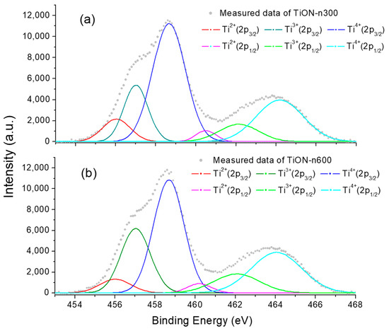 The XPS spectra of Ti for both samples are shown in Figure 9. These signals comprise two groups, the stronger one from Ti 2p3/2 and the weaker one from Ti 2p1/2. Each group can be decomposed into three peaks of Ti2+, Ti3+, and Ti4+. For example, in the Ti 2p3/2 group, the 457 eV and 458.7 eV peaks correspond to the Ti3+ and Ti4+ bonds. The most apparent Ti4+ peak (the blue ones) originates from the normal TiO2. When O2 molecules are less, three O atoms share two Ti atoms, forming Ti2O3 and the weaker Ti3+ peak (the green ones). The Ti3+ peak of TiON-n300 shown in Figure 9a is weaker than that of TiON-n600 shown in Figure 9b. It explains that the transmittance of TiON-n300 is better than that of TiON-n600 shown in Figure 3. The 456 eV Ti2+ peaks (the red ones) come from the Ti–N bonds [52]. Although the PN2 is higher in the TiON-n600 sample, the Ti–N bond is somewhat weaker than that in the TiON-n300 sample. It explains why the TiON-n300 sample exhibits the narrowest energy gap and the best photocatalytic performance.