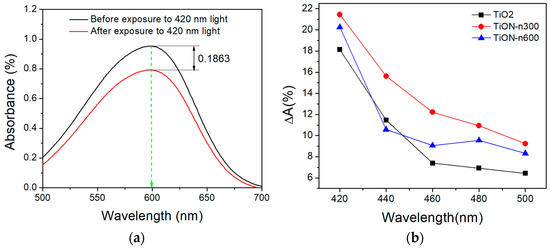The degradation of MB is used to evaluate the photocatalytic performance of N-doped TiO2 films. As the photocatalytic efficiency increases, more MB molecules are decomposed, leading to a decrease in their concentration. According to the Beer–Lambert law, this in turn reduces the absorbance to the light measured at 600 nm since MB exhibits the highest absorbance at this wavelength. Figure 11a shows the absorbance of the pure TiO2 sample in the MB solution before and after exposure to 420 nm light. The efficiencies are qualitatively analyzed by calculating the absorbance difference, such as 0.1863% shown in Figure 11a, before and after the MB solution is reacted with the chosen sample under the exposure of varying photocatalytic light sources. Figure 11b shows ΔA, the absorbance difference divided by the peak value of the absorbance spectrum before exposure, of the samples pure TiO2, TiON-n300, and TiON-n600 in percentage for exposure to photocatalytic lights at 420, 440, 460, 480, and 500 nm wavelength, respectively. As increasing the wavelength, the ΔA value decreases, indicating worse photocatalytic performance. However, the performance of TiON-n600 appears better than that of the pure TiO2 film at excitation wavelengths of 460, 480, and 500 nm. The nitrogen dopant indeed reduces the photocatalytic bandgap. Among these samples, TiON-n300 shows the largest ΔA and hence the highest photocatalytic efficiency, verifying that it has the narrowest bandgap.