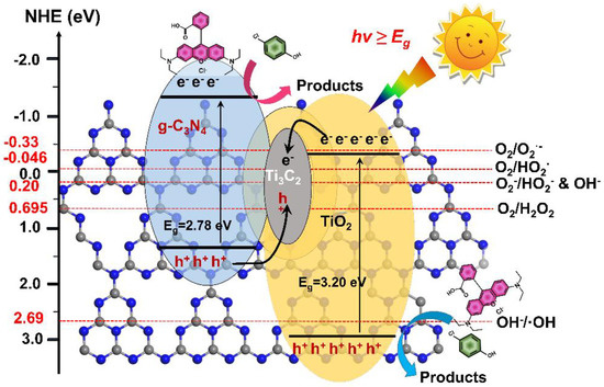 - Li, Y.; Zhang, M.Q.; Liu, Y.F.; Zhao, Q.H.; Li, X.; Zhou, Q.Y.; Chen, Y.F.; Wang, S.F. Construction of bronze TiO2/Ti3C2 MXene/Ag3PO4 ternary composite photocatalyst toward high photocatalytic performance. Catalysts 2022, 12, 599. [Google Scholar] [CrossRef]