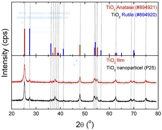 The representative XRD patterns obtained from the P25 and TiO2 films are shown in Figure 2. The thin film prepared comprised an anatase and rutile TiO2 phase, respectively, with all the peaks matching the Joint Committee on Powder Diffraction Standards; JCPDS-ICDD Card No. 894,921 (anatase) and JCPDS-ICDD Card No. 894,920 (rutile), confirming the successful formation of both phases. The XRD pattern for all prepared TiO2 films was similar, and is not included in the figure.