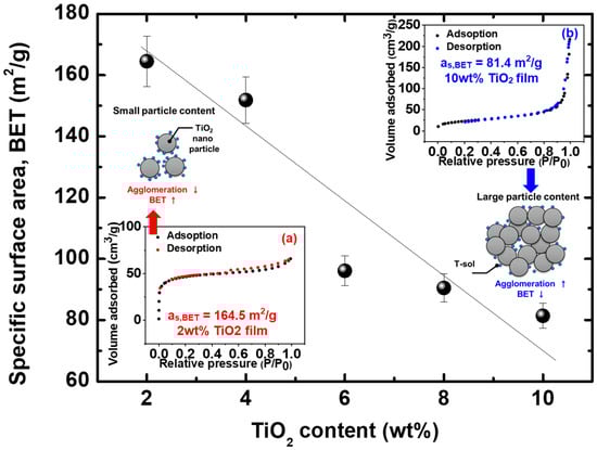 BET analysis image of TiO2 films. The inset figures and schematic images in (a) and (b) show representative BET graphs and synthesis structure diagrams of 2 and 10 wt% TiO2 films, respectively.