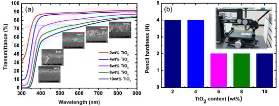 Characterization of TiO2 coating layer with different particle contents—(a) transmittance and (b) pencil hardness. The inset of (a) is an inclined cross-section image observed by SEM. The inset of (b) is the result of the pencil hardness test.