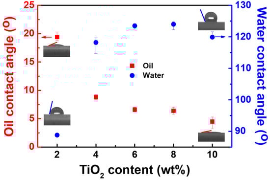 Water and oil contact angle measurement of coating layer with varying TiO2 content.