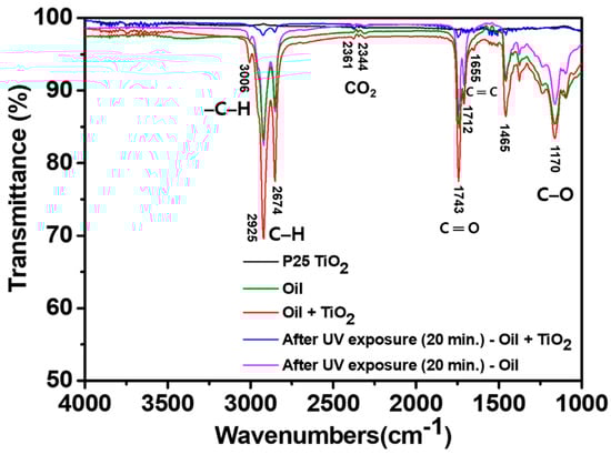 Next, using FT-IR, we evaluated the fingerprint removal performance of the coating layer after UV exposure. Figure 9 shows the FT-IR analysis results. Artificial fingerprints made of oleic acid, squalene, jojoba oil, and corn oil consist of organic compounds. A carbon compound such as C=O, C=C, and CO bonds was suggested in previous studies [,]. In the case of the 2 wt% P25 coating layer, the characteristic peak representing the FT-IR spectrum was reduced after exposure to UV light for 20 min, indicating that CH (2674, 2925, 3006 cm−1), C=O (1743 cm−1), C=C (1655 cm−1), and CO (1170 cm−1) bonds decomposed under UV exposure. In contrast, in the case of glass, no change in the spectrum was seen after exposure to UV light for the same amount of time.
