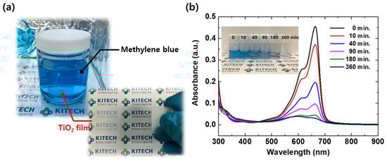 We wanted to ensure that fingerprint oil was naturally decomposed by the heat or light associated with UV light exposure. Changes in artificial fingerprints on glass were observed after UV exposure, but there were few or no changes in the FT-IR spectrum or characteristic peaks. Therefore, successful fingerprint removal from the TiO2 coating layer was confirmed. The TiO2 coating layer produced through this study confirmed whether oil ingredients and various organic matters could be decomposed. This test was carried out using a 2 wt% P25 coating sample in the methylene blue dye solution most commonly used for photocatalyst disassembly. Figure 10a shows the almost complete decomposition of MB within 6 h, without peeling or damage to the coating layer. With an increasing irradiation time, a gradual decrease in the MB peak at 600–680 nm occurred, clearly indicating degradation of the MB dye molecules. Figure 10b shows almost complete degradation of MB within 6 h, without peeling or damage to the coating layer. Since the volume of the MB dye solution (100 cm3) ratio to the TiO2 coating layer volume (3.125 × 10−4 cm3) is very small, this result seems to have taken longer than when using powders. We expected that the rapid decomposition of organic compounds would be possible within a few minutes, when a large number of TiO2 films were used.