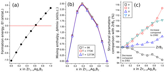 (a) Energy of formation (Ef) and (b) mixing enthalpy (ΔHmix) of α-Zr1−xAgxB2 solid solution as a function of Ag content (x), where the red circle and blue triangle illustrate the impact of the temperature of 773 K and 1273 K on ΔHmix, respectively. (c) Relative values of the hexagonal lattice parameters (a, c) with volume (V) and density (ρ) as a function of Ag content (x) compared with reference ZrB2.