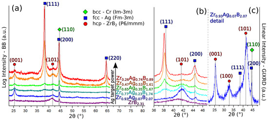 (a) Bragg–Brentano XRD patterns of reference ZrB2+Δ and Zr1−xAgxB2+Δ films, (b) grazing incidence XRD detail on selected reflections indicating presence of segregated Ag phase even at 2 at.% of Ag content, and (c) grazing incidence XRD detail Zr0.93Ag0.07B2.07 pointing out at the presence of (111) Ag reflection.