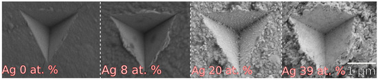 Cube-corner indents of the reference ZrB2+Δ and Zr1−xAgxB2+Δ films are shown in Figure 5. In pure ZrB2+Δ, the presence of clear radial cracks can be observed. With increasing Ag content, a reduction in crack length, circular corrugation, and accumulation of material that can be attributed to increased toughness can be seen.